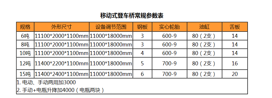 移动登车桥也被称作叉车装卸专用平台,是装卸货物的专用液压设备,设备带有移动轮,可随时移动到装卸地点。移动登车桥根据额定载重量可分为6吨、8吨、10吨、12吨、15吨,设备总长11米,带有坡度,叉车等搬运车辆可通过移动登车桥的坡度和高度直接驶入货车内部进行装卸货物作业,在提高装卸作业效率的同时又能充分保障作业安全。移动登车桥无需外接电源,可通过手压泵做动力进行能设备高度的调整,可以充分适应各种不同高度的货车。移动登车桥加快装卸货物的速度,减少劳动力,为企业获取更大的经济效益。